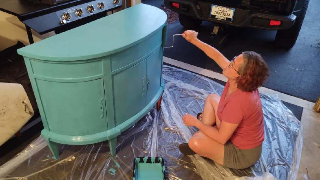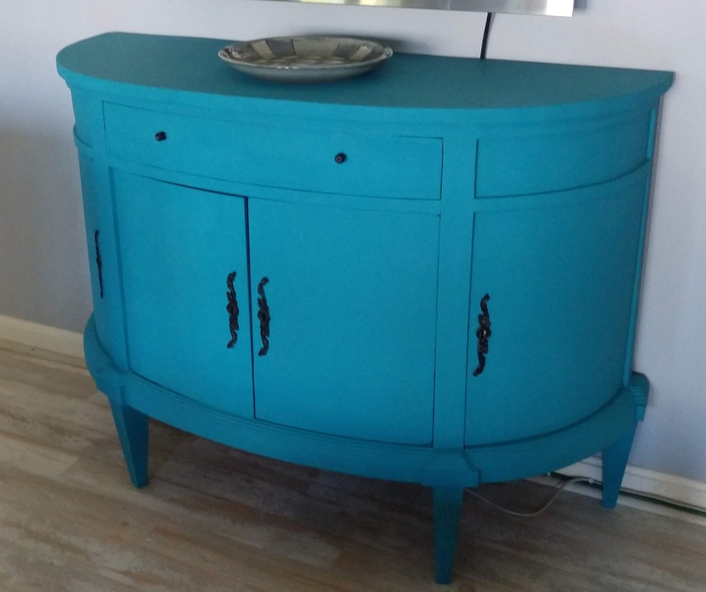 Do you have old furniture that you love but it is kind of “blah”? After a light sanding using a 60-Grit sanding sponge, this old piece was ready for it’s new look. Using high quality chalk paint and a small roller made this project go from start to finish in hardly any time at all. We used black spray paint on the door pulls and locks and just love how this piece turned out.