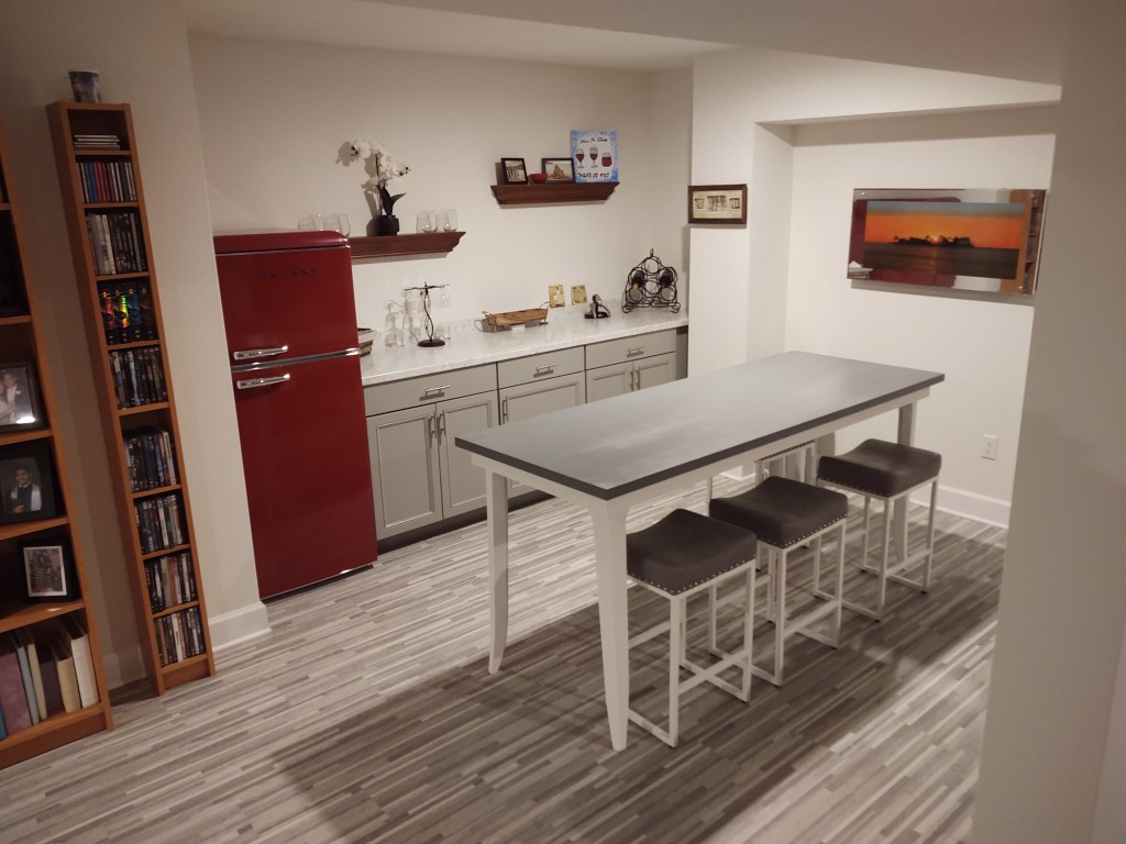 This client wanted to add some pizazz to their finished basement by adding a dry bar and custom table for entertaining.