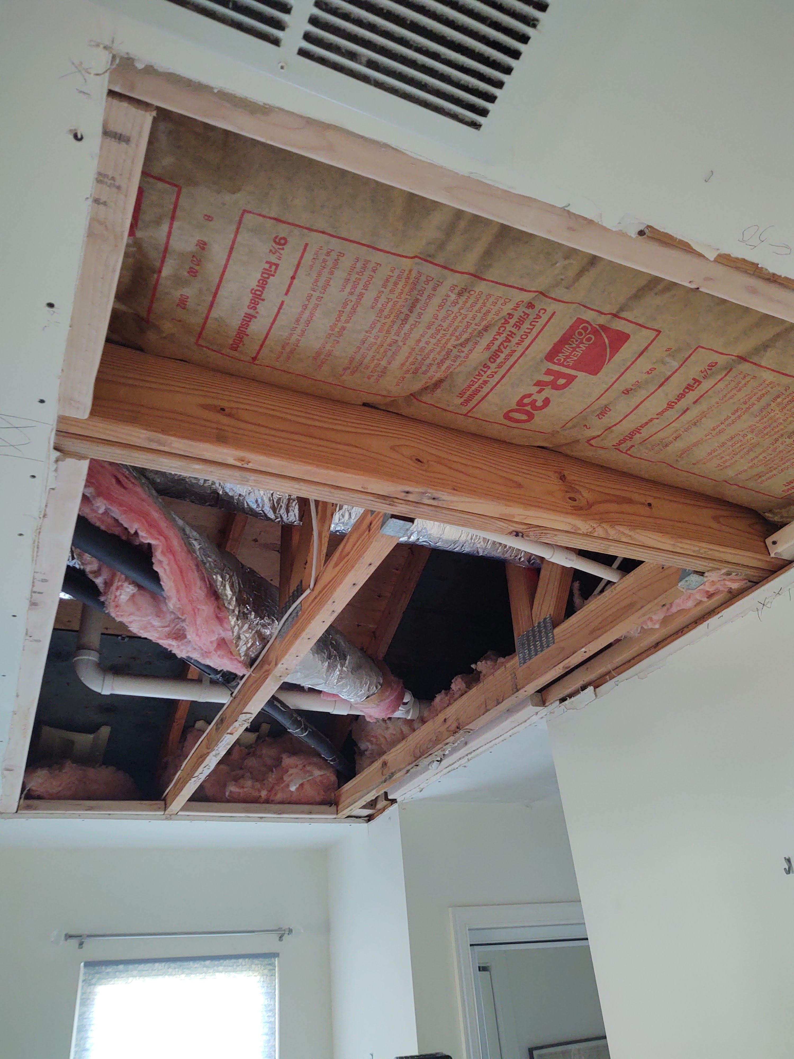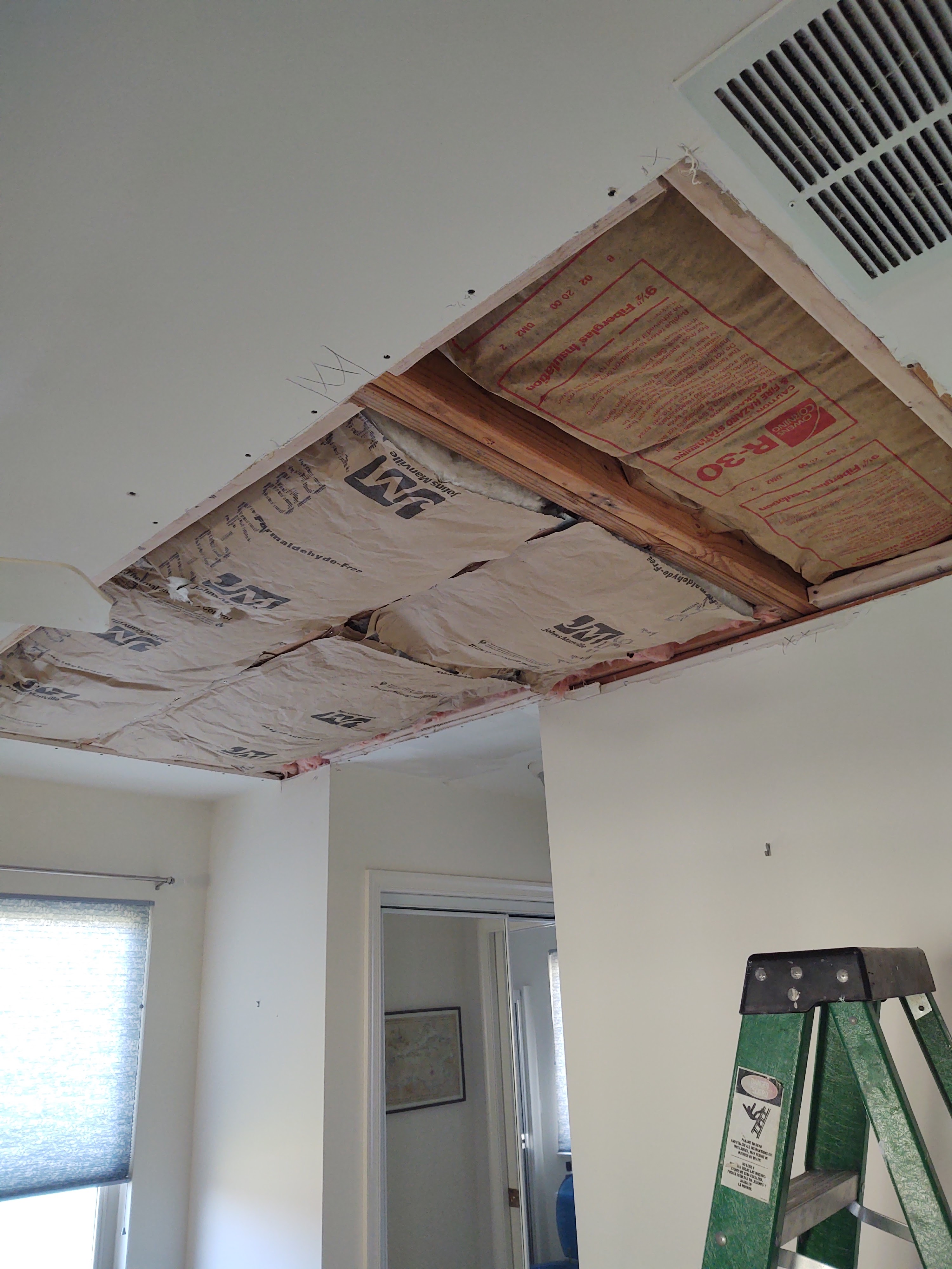 So, Jeff had to cut away the damaged pieces and add blocking before he could replace the drywall and reinsulate the ceiling.
