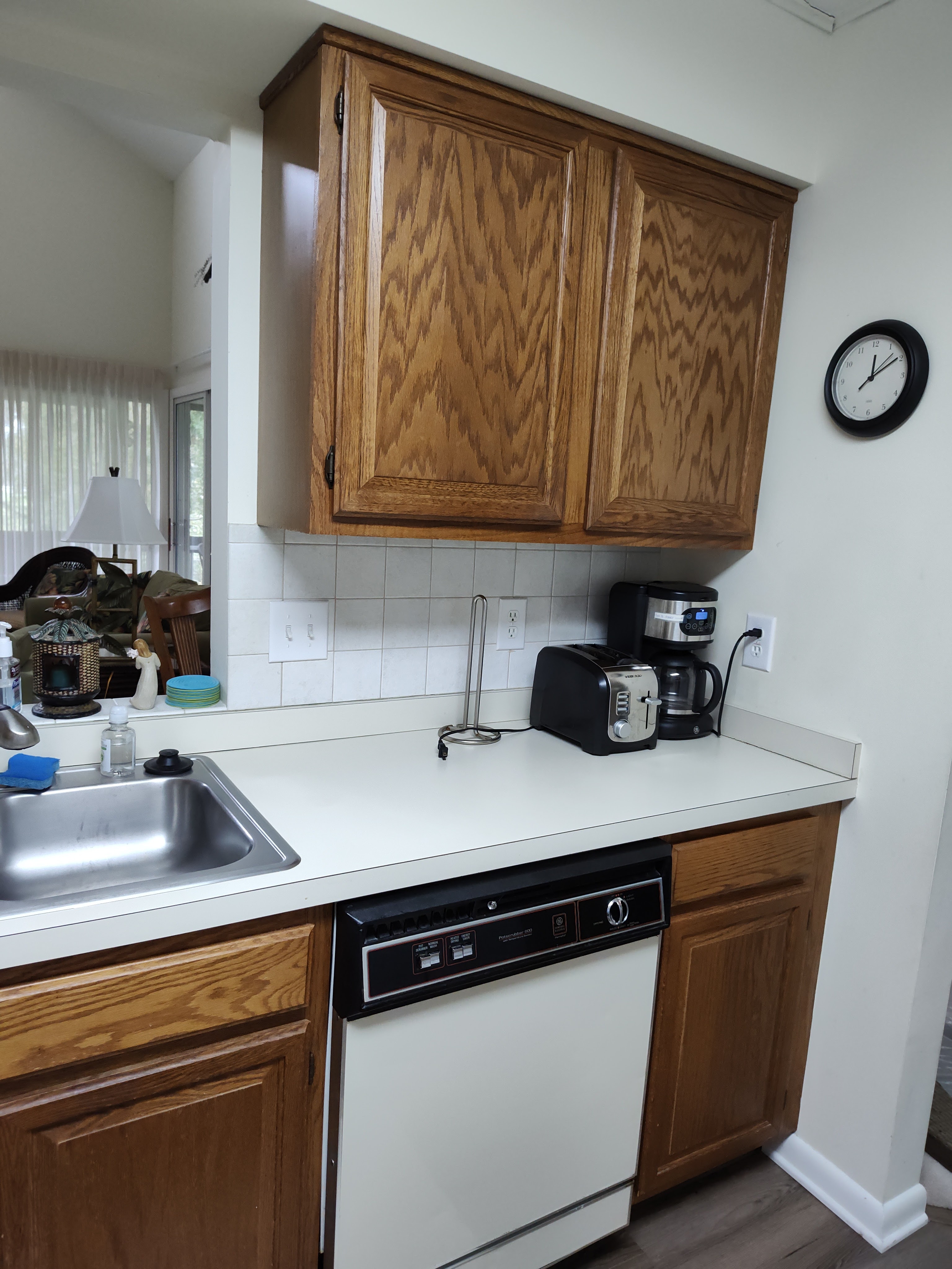 Why replace your kitchen cabinets when you can up-cycle them with a good paint job? Quality wooden cabinets like these are expensive to replace.